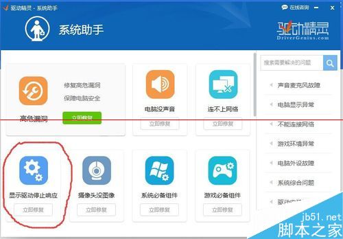 2、安裝完后打開驅動精靈軟件,點擊窗口左下角“系統助手”,然后找到“顯示驅動停止響應”,點擊圖標進入或者點“立即修復”