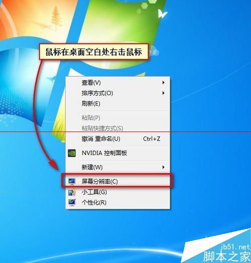 以win7系統為例,以前的xp系統是用鼠標在桌面空白處點擊【右鍵】然后選擇【屬性】,在屬性里【設置分辨率】的。而win7則有些不同,首先鼠標在桌面空白處【右鍵】,在右鍵菜單中直接顯示了【屏幕分辨率】的選項,用鼠標點擊一下這個選項。