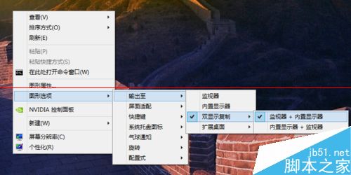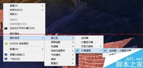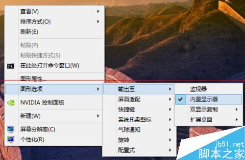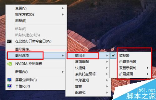 2、在桌面空白處單擊右鍵,依次選擇“圖形選項”--“輸出至”,在后面彈出的子菜單中有四個選項,不同的選項對應不同的輸出選項,下面依次講解。如下圖