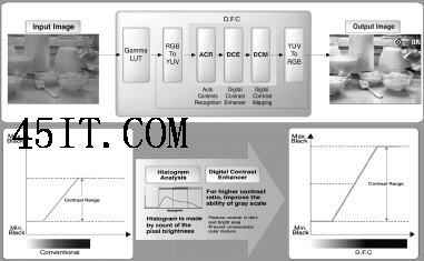 LG“銳比”工作示意圖 通常來說,每個圖像都包含不同的對比度,大部分圖像都是處于黑暗、明亮或兩者之間。物理對比度調(diào)節(jié)是通過調(diào)整黑白平衡來實(shí)現(xiàn)的,在實(shí)際使用中我們都有這樣的感受―如果你將對比度調(diào)向偏亮?xí)r,整個畫面都會發(fā)白而失真;如果將對比度調(diào)向偏暗時,整個畫面都會變黑,使得部分有色彩的地方也被黑色所遮蓋。