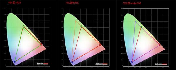 色域方面,我們利用Spyder5Elite 5.2對該機的屏幕色域進行實際測試,最終我們測出該機的sRGB色域為98%,NTSC色域為72%,AdobeRGB色域為76%,作為一款主打電競游戲的顯示器來說,AOC AG251FG色域表現已經比較出色了。