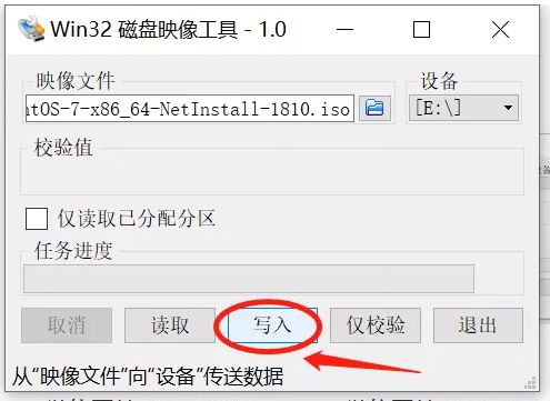 接著點擊“寫入”(如下圖示),從“映像文件”向“設(shè)備”傳送數(shù)據(jù)。