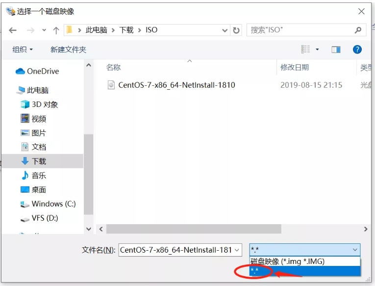 點擊“映像文件”,可“選擇一個磁盤映像”,筆者這里選擇的是CentOS7。注意:如果文件類型不為img格式,需要在文件類型篩選時選擇*.*以匹配任意格式(如下圖示)。