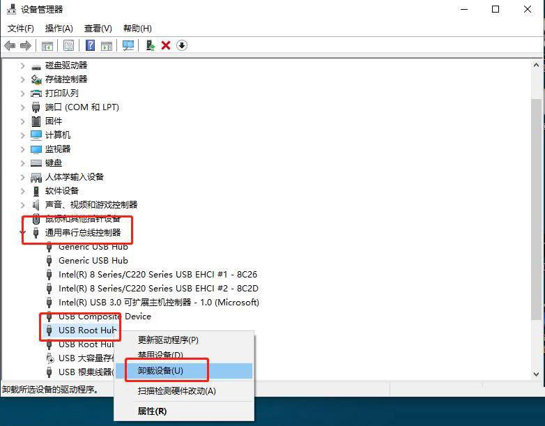 2、在頁面中,選擇“通用串行總線控制器”,右鍵“USB Root Hub”,選擇“卸載”或“刪除”