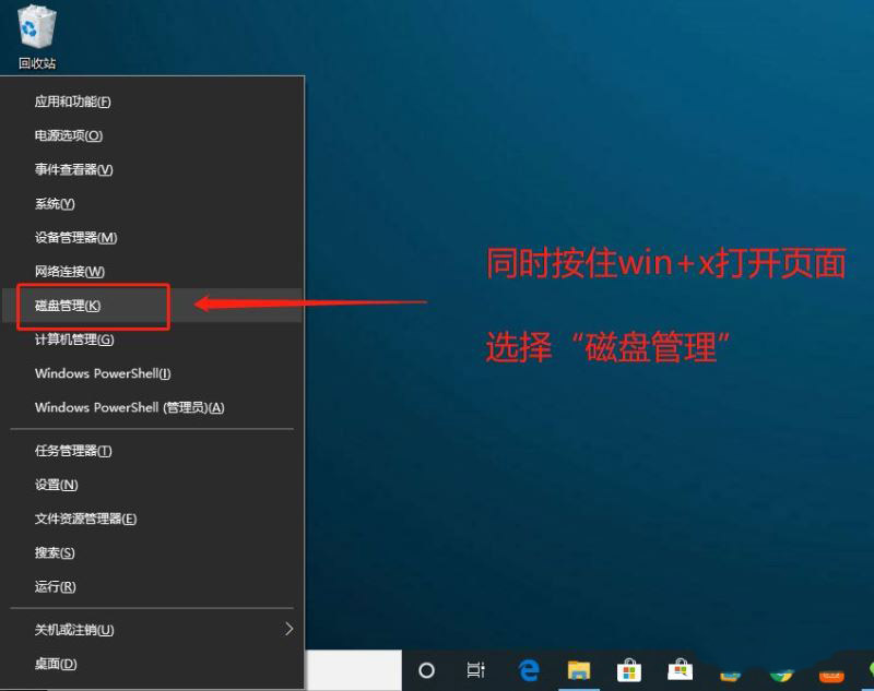 1、同時(shí)按住“win+X”,在彈出的頁面中選擇“磁盤管理”