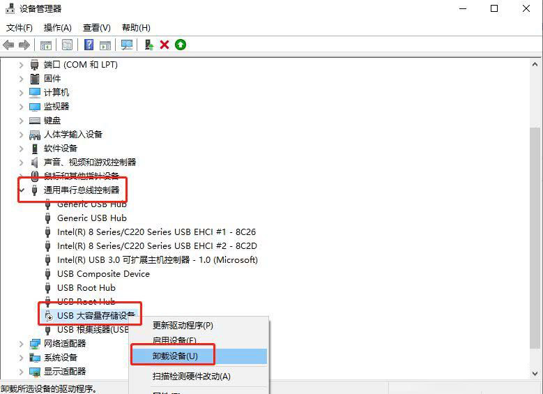 2、在頁面中,選擇“通用串行總線控制器”,右鍵“USB大容量存儲設(shè)備”,選擇“卸載設(shè)備”