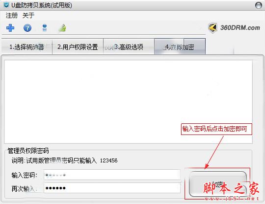 5、輸入密碼 “123456”, 然后點(diǎn)擊“加密”按鈕即可自動(dòng)完成加密,加密成功后,軟件將自動(dòng)彈出U盤。