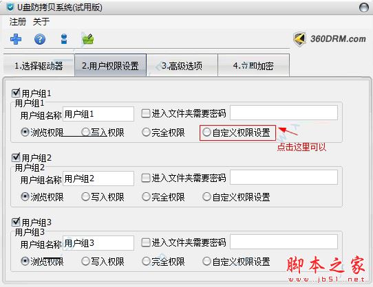 2、這是權(quán)限設(shè)置頁(yè)面, 點(diǎn)擊"自定義權(quán)限設(shè)置", 可以對(duì)權(quán)限進(jìn)行自定義設(shè)置,自定義權(quán)限可以自由組合這些權(quán)限限制。