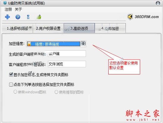 4、在高級(jí)設(shè)置窗口,我們可以對(duì)軟件界面,加密強(qiáng)度進(jìn)行設(shè)置, 首次使用建議您使用默認(rèn)的設(shè)置,待熟悉軟件后,再進(jìn)行相應(yīng)的修改。