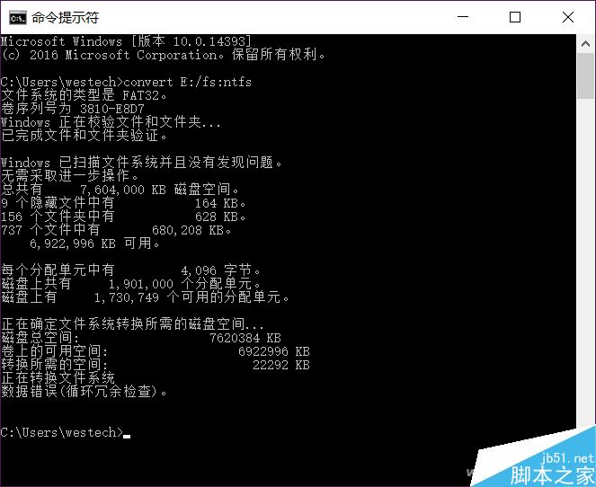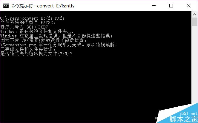 修復完畢,重新在提示符下輸入轉換命令進行轉換,根據U盤空間大小以及存儲文件的多少,進行轉換時間也長短不一。