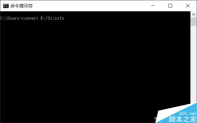 在命令行模式下輸入convert E:/fs:ntfs回車,注意中間空格,同時,E是小編電腦上的U盤盤符,要根據自己的盤符進行修改。