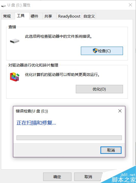 如果U盤存在錯誤,系統會出現提示,注意,這時候也僅僅將錯誤的文件鏈接修復,并不能真正修復U盤。這時候還要退回倒我的電腦,右鍵單擊磁盤選擇屬性,在工具項中選擇“檢查”執行修復工作。
