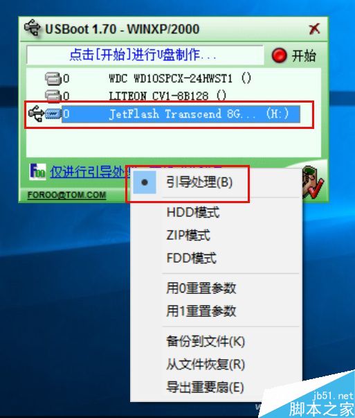 下載運行USBOOT程序,選擇要修復的U盤及工作模式(引導處理),然后點擊“開始”按鈕即可。