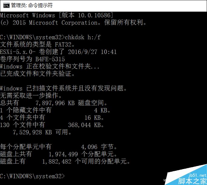 比如小編的問題U盤是h盤,所以修復這個h盤就需要輸入“chkdsk h:/f”這個命令。