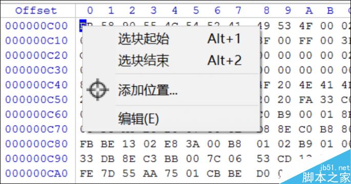 在offset找到0000 0C00一欄,用鼠標選中E,然后右鍵選擇選塊起始位置