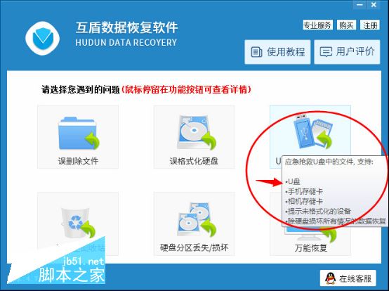 1) 打開(kāi)互盾數(shù)據(jù)恢復(fù)軟件,在眾多功能中選擇“U盤(pán)手機(jī)相機(jī)卡恢復(fù)”功能,這一功能是專門(mén)針對(duì)U盤(pán)、手機(jī)儲(chǔ)存卡等數(shù)據(jù)恢復(fù)的。
