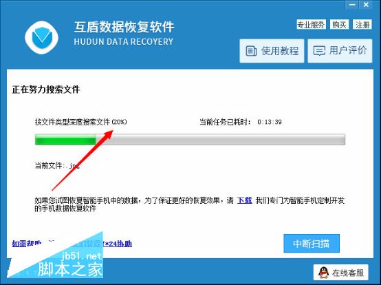 3) 軟件進(jìn)入掃描狀態(tài),如果您剛剛刪除文件,可以選擇在掃描到10%~20%時(shí)中斷掃描,沒(méi)有必要掃描全部,這樣可以節(jié)省大部分的時(shí)間。