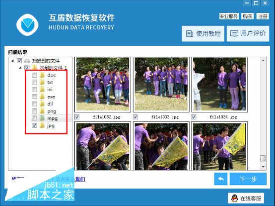 4) 軟件掃描后,我們將會(huì)在軟件左側(cè)看見(jiàn)該U盤(pán)中所有數(shù)據(jù)文件列表,這里請(qǐng)選擇相應(yīng)的文件夾,如果是想要恢復(fù)圖片請(qǐng)選擇“jpg、png”等;如果想要恢復(fù)文檔,可以選擇“txt、doc”等。