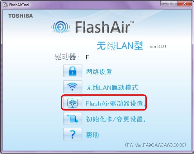 Step 1、將FlashAir™插入電腦SD卡插槽,啟動FlashAir™Tool程序 (Ver3.00及以后版本)。點擊“FlashAir驅動器設置”。
