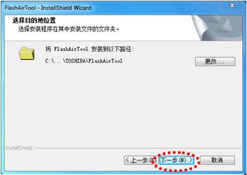 選擇安裝配置軟件的文件夾,并點擊“下一步”。 軟件將默認安裝于文件夾“C:/Program Files/TOSHIBA/FlashAirTool”中。 如果你希望將軟件安裝于其它文件夾,則點擊“更改”并指定文件夾。 (本手冊中將安裝至默認文件夾中。)