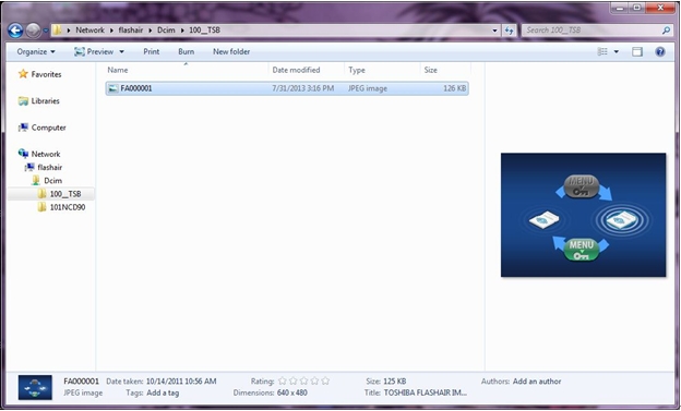 Step 5、雙擊電腦桌面的快捷方式,打開Windows®Explorer,FlashAir™將顯示在網絡文件夾里。將照片或者文件讀取到電腦時,請選擇文件并拖拽到電腦上。