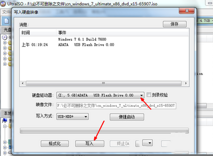 在寫入硬盤映像的頁面中,選擇好你所要制作的U盤。如圖示,“硬盤驅動器”里就是選擇你要刻錄的U盤,這里演示用的是一張數碼相機的內存卡。寫入方式默認是USB-HDD+,還有USB-HDD、USB-ZIP、USB-ZIP+,共四種供選擇,這主要取決于你的主板支持的啟動類型,可以在刻錄前進CMOS看一下,注意有的主板需要插入U盤才會顯示支持的類型。U盤可以在刻錄前格式化,也可以通過底下的“格式化”按鈕進行,當然直接點“寫入”也可以,會自動格式化。