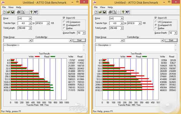 ATTO Disk Benchmark是一款簡單易用的磁盤傳輸速率檢測軟件,使用了不同大小的數據測試包,數據包按0.5K、1.0K、 2.0K直到到8192KB進行分別讀寫測試,測試完成后數據用柱狀圖的形式表達出來,很好的說明了文件大小比例不同對磁盤速度的影響。本次測試選取了從4KB到8192KB的數據包進行讀寫測試。