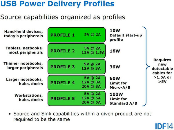 而USB 3.1 Type-C的另一個大賣點就是對移動設備充電能力的的增強。USB 3.1接口下的供電最高允許標準大幅提高到了20V/5A(僅限于Type-A/B),能夠提供達100W的供電輸出能力。而Type-C的最高標準為12V/3A,36W的充電能力已經足夠一些輕薄型筆記本的使用,這也是New MacBook敢于放棄MagSafe而采用Type-C作為充電接口的重要原因。