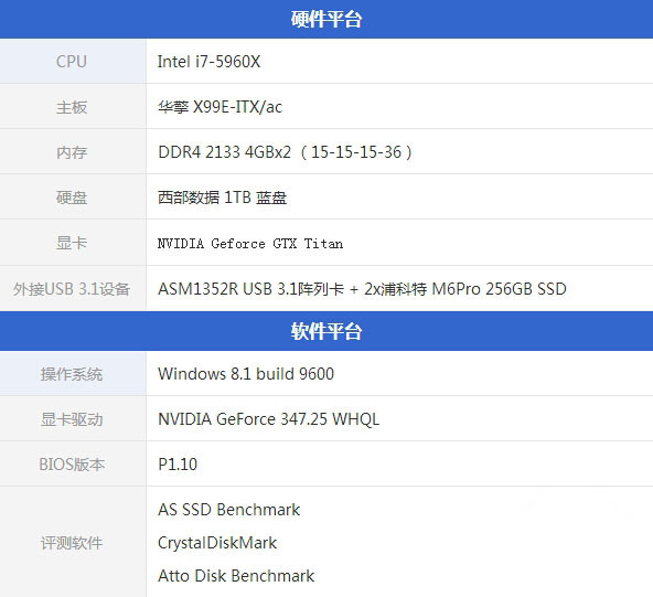 為了測試現有USB 3.1接口方案的實際速度,我們使用了CrystalDiskMark、AS SSD Benchmark、Atto Disk Benchmark三款常用的存儲設備測速軟件進行測試,并通過對比使用相同外接設備接入到原生USB 3.0接口時的傳輸速度,看看現有第三方的USB 3.1方案,比起原生USB 3.0能夠有多大的提高。