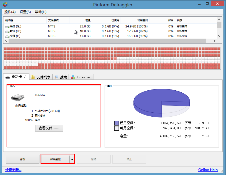 4、接下來工具將開始掃描所選擇的磁盤,靜待分析工作完成。如果存在磁盤碎片,我們可點擊“磁盤整理”按鈕開始進行碎片整理的操作,如果沒有磁盤碎片。可嘗試選擇其他磁盤進行分析掃描,如下圖所示