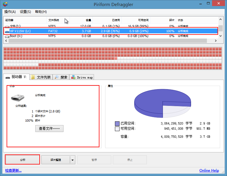 3、在打開的碎片整理程序工具窗口中,選擇需要進行磁盤碎片掃描的硬盤,再點擊左下角的“分析”按鈕,如下圖所示