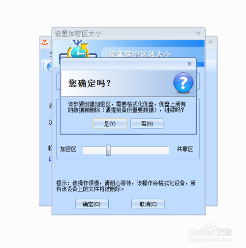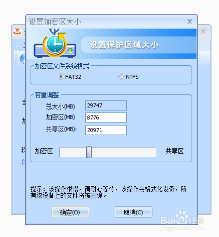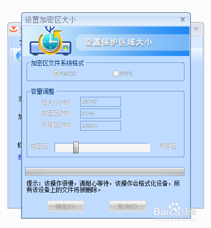 4、確定之后,就會出現一個分區的窗口,您可以通過滑塊或者手動輸入的方式確定你想要分區的大小,單位是MB,我就設立了1024*6=6144MB的加密區,加密區確定好了之后點擊“確定”接下來就出現提示要格式化您的優盤了,因為之前我們已經處理過,所以這部直接點確定就可以啦!