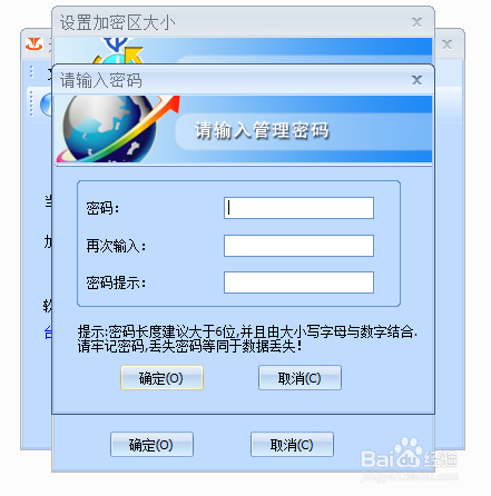 5、接下來要設置密碼,也就是訪問你優盤加密區時需要輸入的密碼,這個可以根據要求自由設置,最好是字母和數字結合的,比較不容易破解,設置好密碼后,在第三項填寫密碼提示,在你想不起來密碼的時候可以提示你,一般寫幾個自己能懂的字母作為提示就可以,填好后點擊確定,然后稍微的等待一會