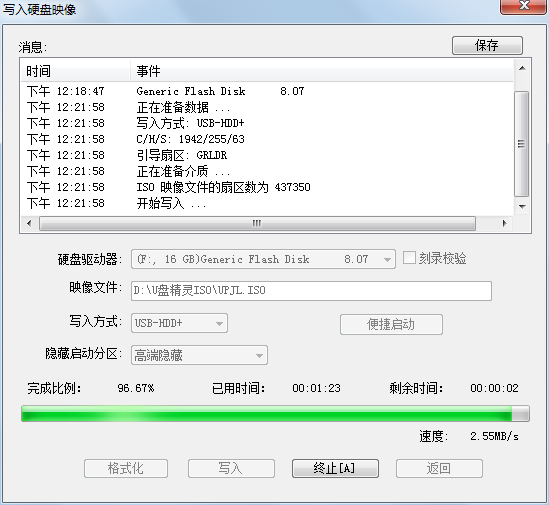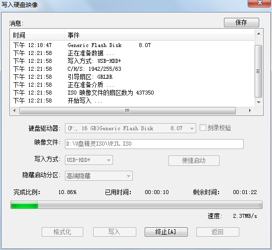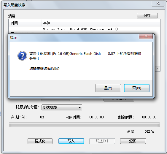 因為用ISO模式制作U盤啟動盤也會格式化全盤,所以在制作前同樣需要注意U盤上的數據安全。點擊“是(Y)”即可開始制作,如下圖: