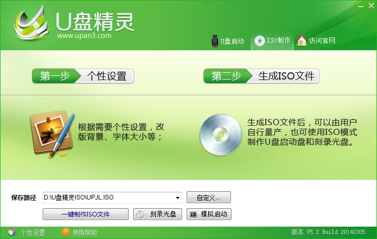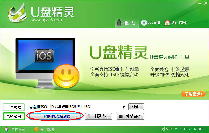 如果出現了上圖所示界面,則說明U盤啟動是制作成功的??梢园咽髽艘频?ldquo;電腦模擬器”窗口,單擊一下,則把鼠標焦點移動到模擬器內,那么此時我們按鍵盤上的上下鍵是可以選擇菜單條的,說明制作的啟動U盤是沒有問題的,接著按鍵盤上的CTRL鍵和ALT鍵則可以把鼠標焦點移到外面來,點擊關閉,即可回到主界面。 那么到現在為止用“普通模式”制作U盤啟動盤就完成了。 B 、ISO模式 如果我們是第一次使用ISO模式的話,需要首選在ISO制作頁面制作ISO文件,點擊主界面上的“ISO制作”按鈕,切換到ISO制作頁面,如下圖: