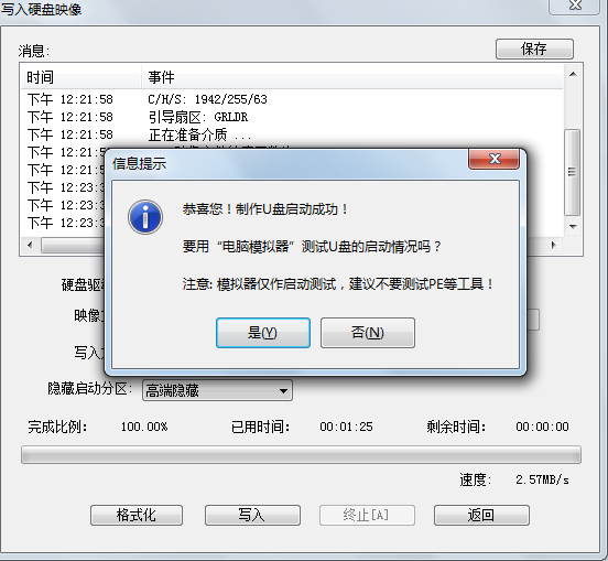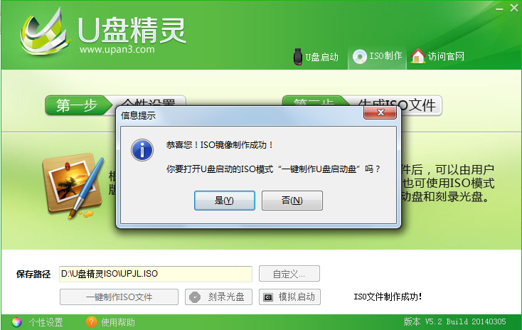 制作完成后出現以下提示: 點擊“是”則回到“U盤啟動”頁面的“ISO模式”頁:
