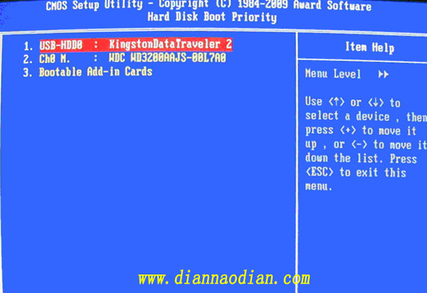 上圖3:硬盤啟動優(yōu)先級(Hard Disk Boot Priority)選擇:使用小鍵盤上的加減號“+、-”來選擇與移動設備,將U盤選擇在最上面。然后,按ESC鍵退出,回到圖2的設置界面。