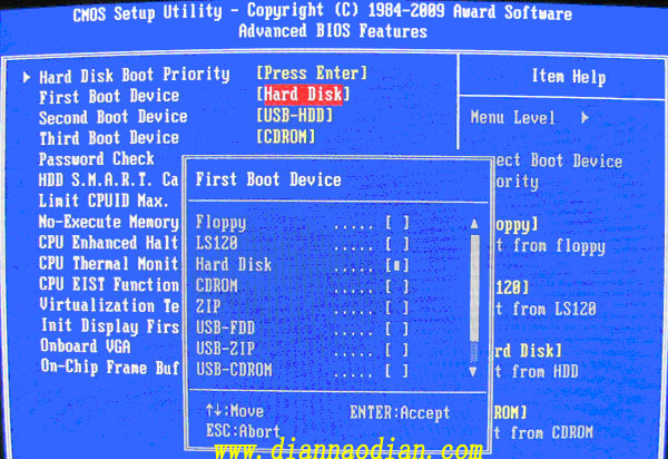 上圖8:在第一啟動設備(First Boot Device)這里,有U盤的USB-ZIP、USB-HDD之類的選項,我們既可以選擇“Hard Disk”,也可以選擇“USB-HDD”之類的選項,來啟動電腦。