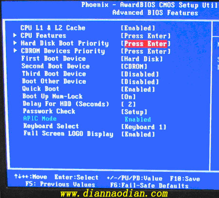 上圖2:高級BIOS設置(Advanced BIOS Features)界面,首先選擇硬盤啟動優(yōu)先級:Hard Disk Boot Priority