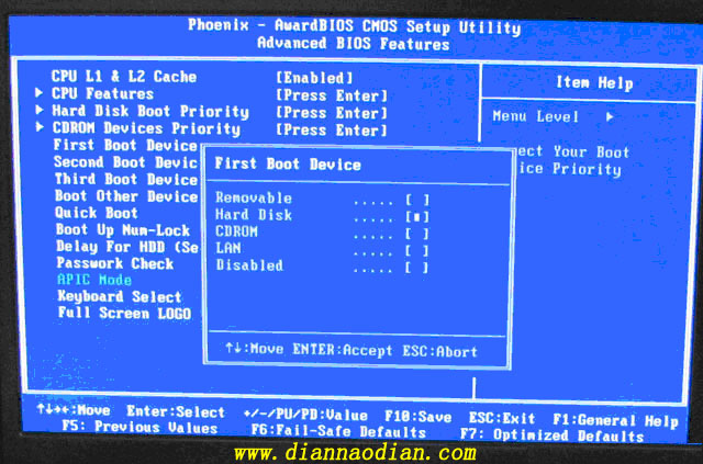 上圖4:再選擇第一啟動設備(First Boot Device):該版本的BIOS這里沒有U盤的“USB-HDD”、“USB-ZIP”之類的選項,經嘗試選擇移動設備“Removable”不能啟動,但選擇“Hard Disk”可以啟動電腦。
