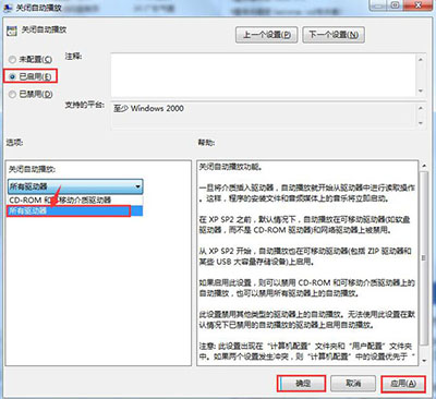 3、在彈出的窗口中,勾選“已啟用”復選鈕,然后在“關閉自動播放”框中單擊“所有驅動器”,點擊應用--確定進行保存,最后關閉“組策略”窗口。