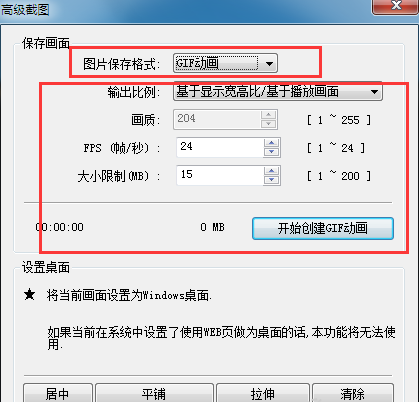 4、在“高級截圖”的“圖片保存格式”中選擇“GIF動畫”,之后再設置一下動圖的幀數(shù)、大小以及保存位置等,設置完畢后點擊“開始創(chuàng)建GIF動畫”就可以了。