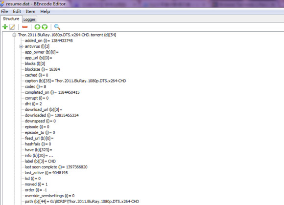1、將UT的resume.dat配置文件拖入BEncode Editor(請(qǐng)先備份該文件以防意外發(fā)生)