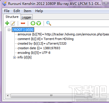 1、將待修改的Rurouni Kenshin 2012 1080P Blu-ray AVC LPCM 5.1-DIY-HDWinG.torrent文件拖入BEncode Editor(請(qǐng)先備份該文件以防意外發(fā)生)
