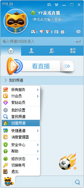 Step1:注冊好YY號之后,登陸YY,點擊YY左下角的YY熊選擇“創建頻道”。