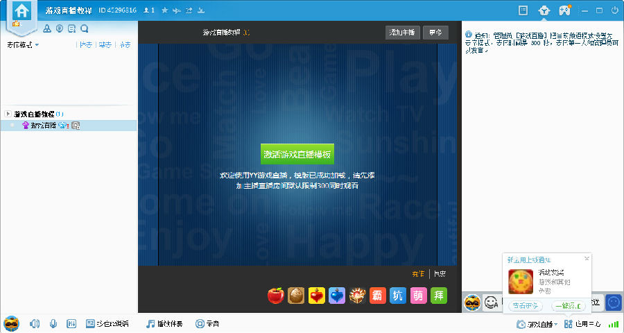 Step4:頻道管理員登陸YY進入頻道,在頻道下方“頻道模板”處選擇“游戲直播”模板,這樣頻道就擁有了游戲直播的權限。