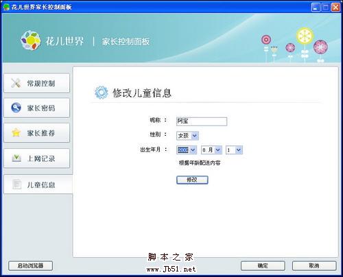 花兒世界瀏覽器會(huì)根據(jù)不同年齡段的兒童用戶提供不同的健康內(nèi)容,因?yàn)樵诔醮螁?dòng)軟件時(shí)即會(huì)提示孩子們輸入自己的呢稱、性別、出生年月等信息,由此來(lái)判別并配送適合的內(nèi)容。軟件溫馨的地方在于隨著孩子年齡增長(zhǎng),不需要重新更改信息。也就是說(shuō)花兒世界可以一直伴隨著孩子們的成長(zhǎng)更好的滿足學(xué)習(xí)娛樂(lè)需要,充當(dāng)它綠色健康的引導(dǎo)教育作用。如果初使用時(shí)沒(méi)有仔細(xì)填寫,新版本可以在“家長(zhǎng)控制面板”中來(lái)后期添加這些信息,以便更好的滿足學(xué)習(xí)娛樂(lè)需要,如圖6所示。