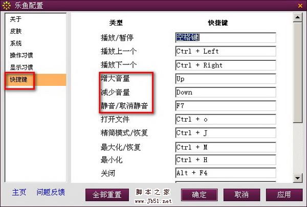 往往還有很多網友喜歡用快捷鍵,因為這樣用起來方便也簡單,只要記住快捷鍵直接使用而不必用鼠標,當然不同的軟件不同的操作都會有快捷鍵,那么初次使用樂魚影音盒在哪里找到快捷鍵來調節音量呢?點擊右上角的樂魚配置按鈕,選擇快捷鍵,進入快捷鍵窗口,如下圖所示:
