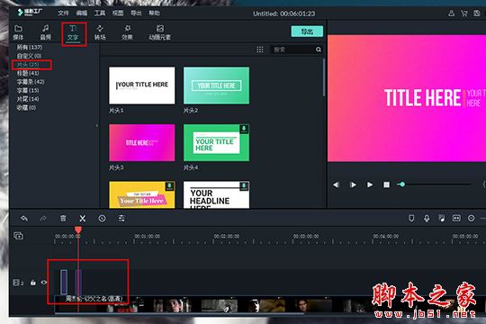 2、下面就來說說怎么添加片頭,首先在上方的欄目中選擇“文字”功能,找到其中的“片頭”分類,接著在眾多片頭內容中選擇自己最喜歡的那一種將其添加到時間軸中,當然你也就可以添加多個不同的片頭,效果也是根據視頻本身的內容而決定的,如下圖所示: