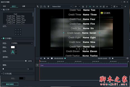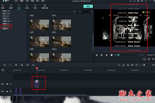 3、片頭添加完成后,就可以添加片尾了,所謂的片尾就是指視頻或電影在播放完成后的人員名單與介紹,大家可以在右邊的播放窗口看到片尾的具體效果,最后將片頭與片尾放置到合適的位置,如下圖所示: